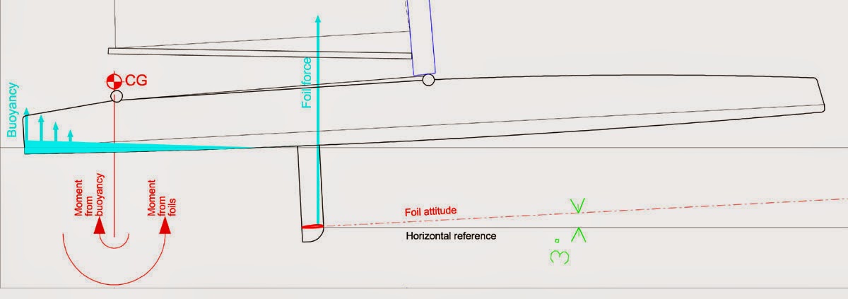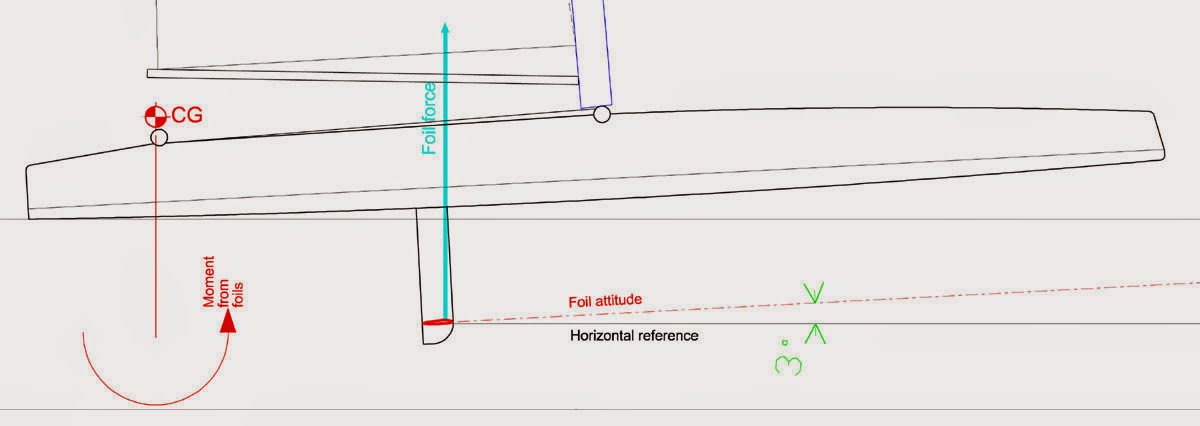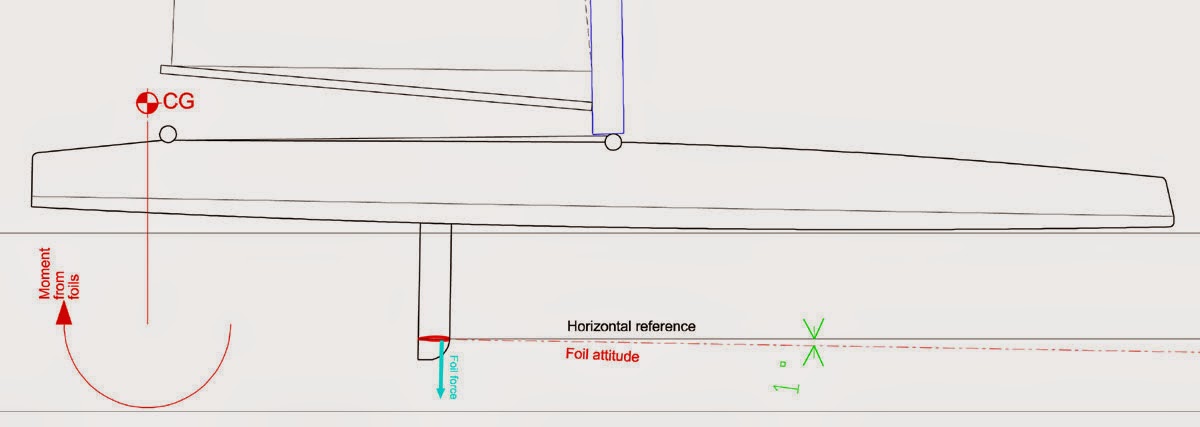 The first diagram in this post shows the situation when the boat is sailing with significant weight on the foils and the crew positioned right at the back.