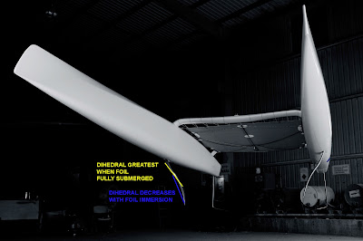 When underway, the effective dihedral angle is self regulating through the variation in curvature of the S foils. As ride height increases, the part of each foil that remains in the water becomes progressively more vertical, reducing dihedral.