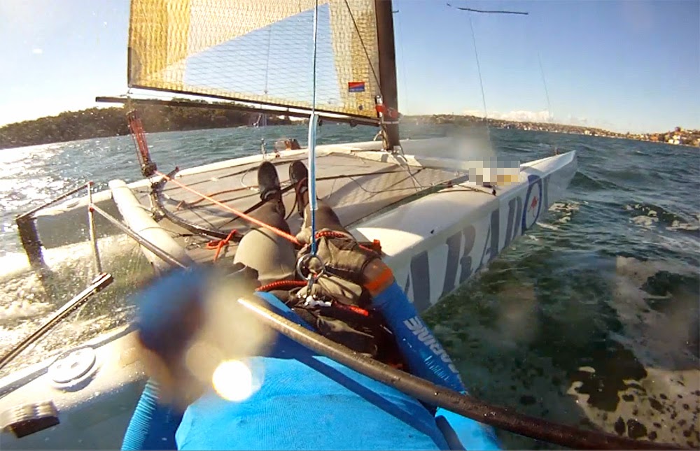 Relatively quickly we came to some definite conclusions regarding ideal tip-up angle, shape, and area for reliable stable foiling using the leeward foil only. Needless to say this configuration is extremely promising with upwind foiling and foiling jibes being a given. The key is the ability to use all the beam of the boat to generate righting moment. A marked difference can definitely be felt when the windward foil is out of the water and no longer pushing the windward hull up.